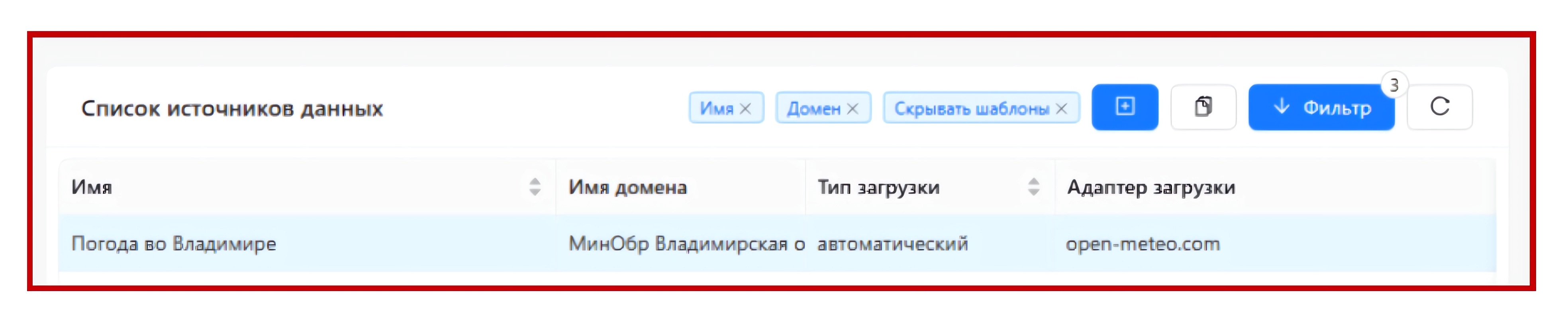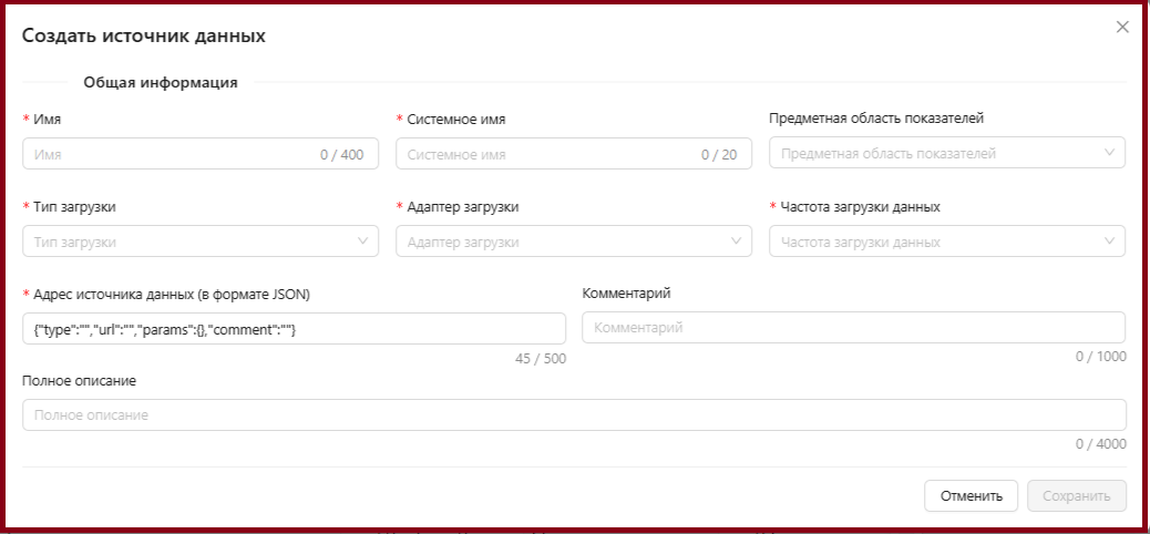 - Адрес источника данных (в формате JSON) – путь к источнику данных. Является обязательное поле для первых двух источников данных;