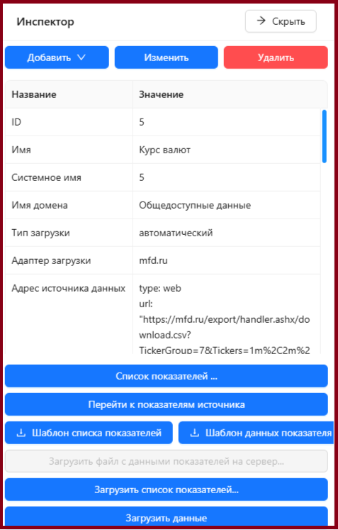- Кнопка «Загрузить данные» – система, используя адаптер загрузки, либо автоматически подключается к ресурсу (интернет источник, сетевой диск), либо, в случае локальной загрузки, предлагает выбрать файл с данными на устройстве пользователя, далее берет и загружает в систему данные «Показателей». Перезагрузка данных показателя за определенный период перезаписывает старые данные показателя за этот же период.