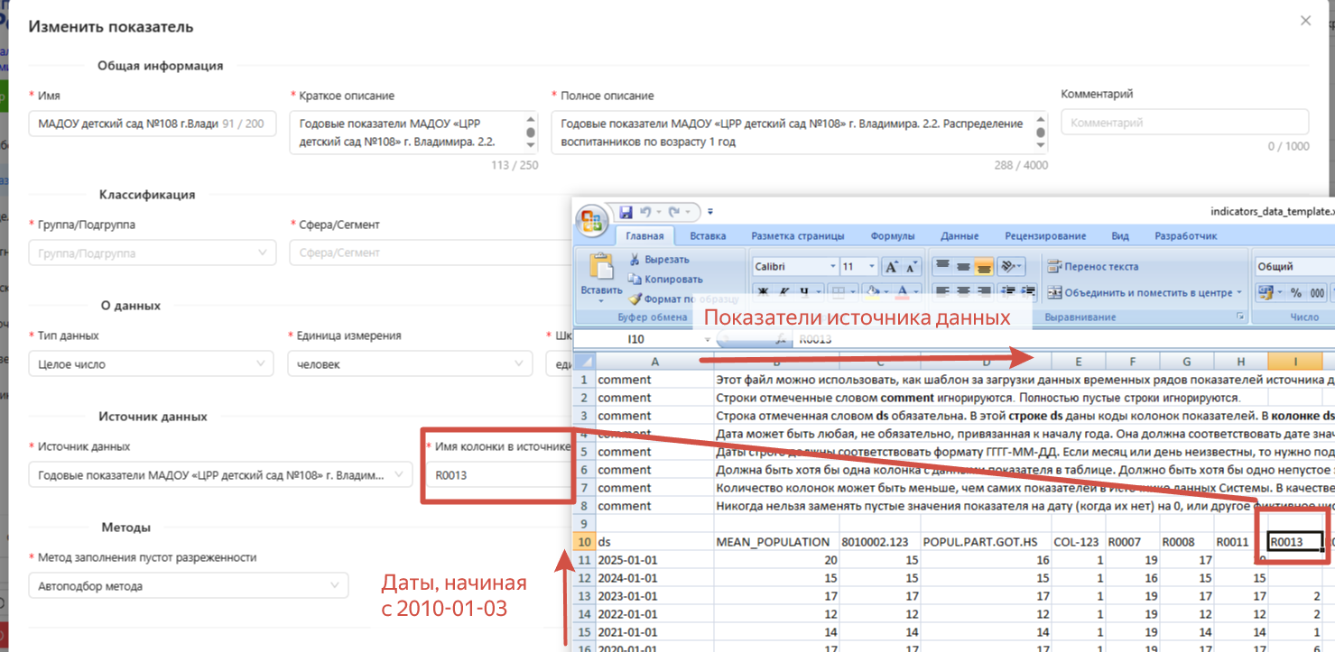 - Кнопка «Шаблон данных показателя» – скачивается файл-шаблон (indicators_data_template.xlsx). Структура файла системой собирается автоматически: по горизонтали (колонки) – перечислены имена «Показателей» из реквизита «Имя колонки в источнике данных» на дату выгрузки шаблона; по вертикали (строки) – сгенерированы даты, начиная с 03-01-2010 по текущее (последнее прошедшее) воскресенье с квантованием в месяц. В данный момент файл статичен, имена колонок указаны для примера. В ближайшее время планируется доработка – имена колонок будут сгенерированы исходя из реальных данных системы по конкретному выбранному источнику данных;