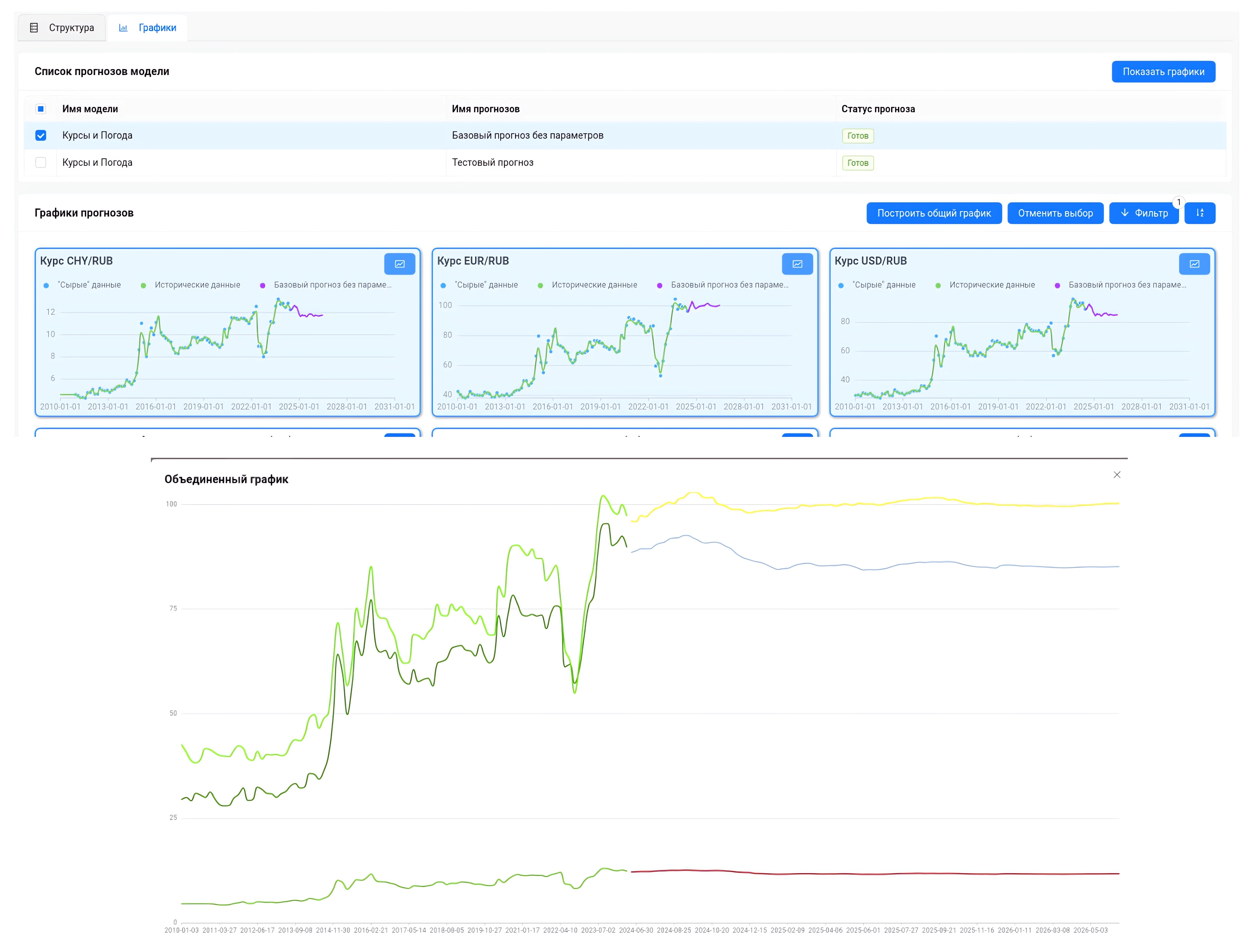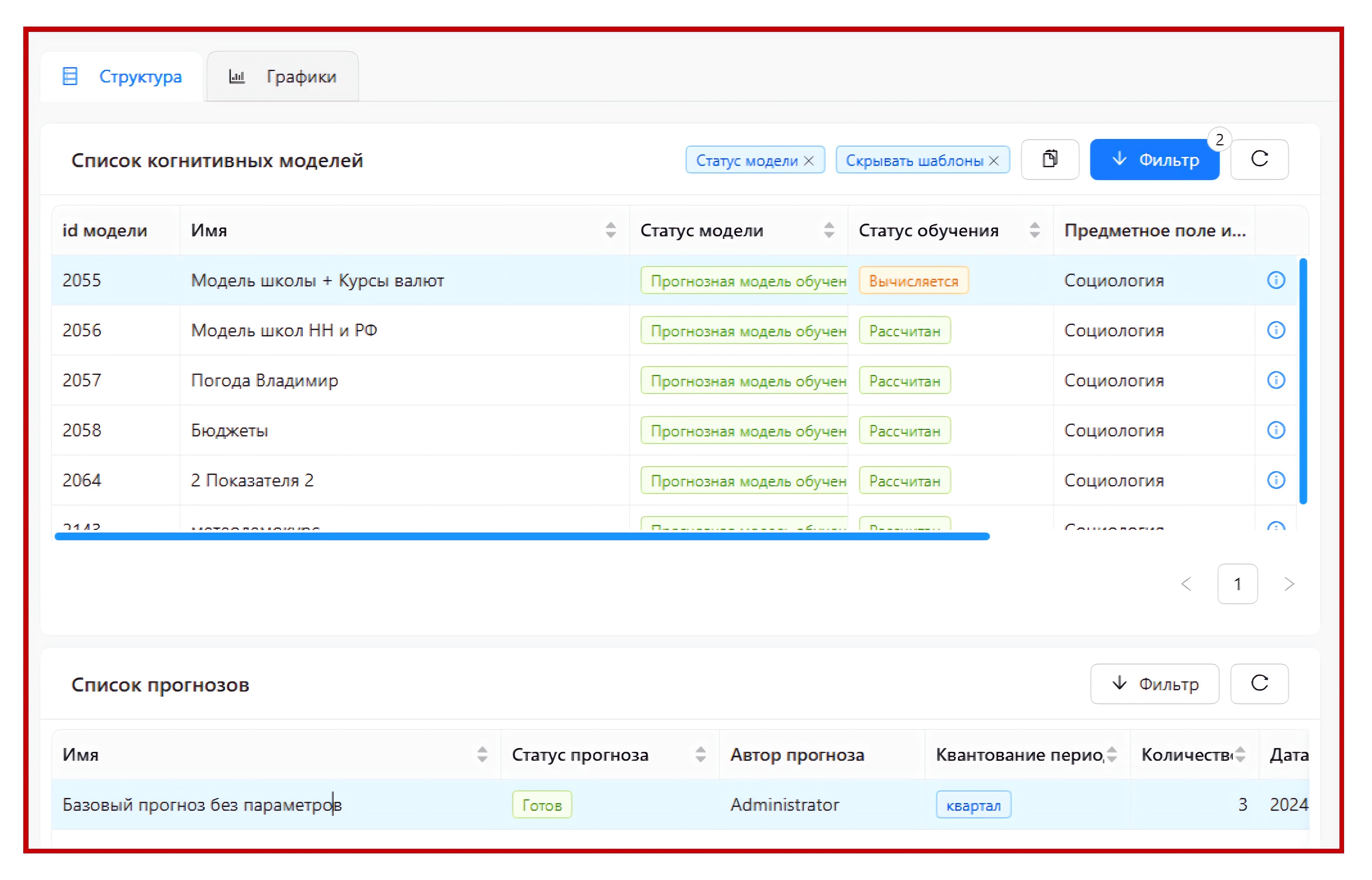После обучения Прогнозной модели можно приступить к прогнозированию. У когнитивной модели может быть несколько именованных прогнозов, которые можно сравнивать и показывать.