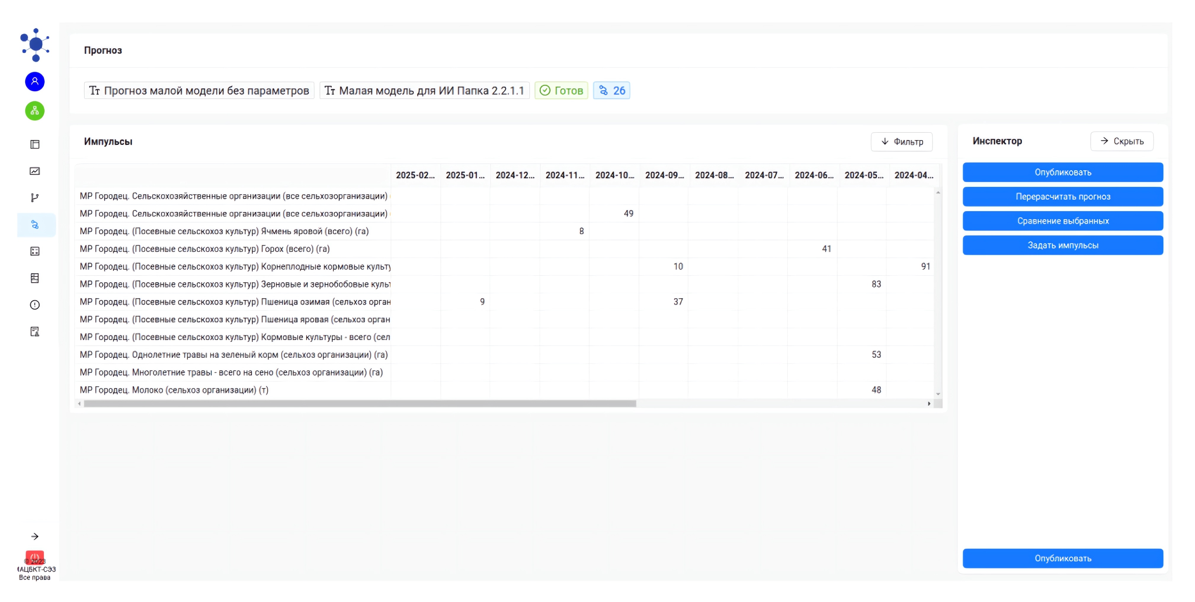 Прогнозирование может быть пассивным и проактивным, когда мы задаем импульсы на факторы в будущих периодах. Для этого есть специальная форма. В ней выборочно проставляются экспертом значения ипульсов. После чего делается расчет прогноза, и он сохраняется для его последующего анализа.