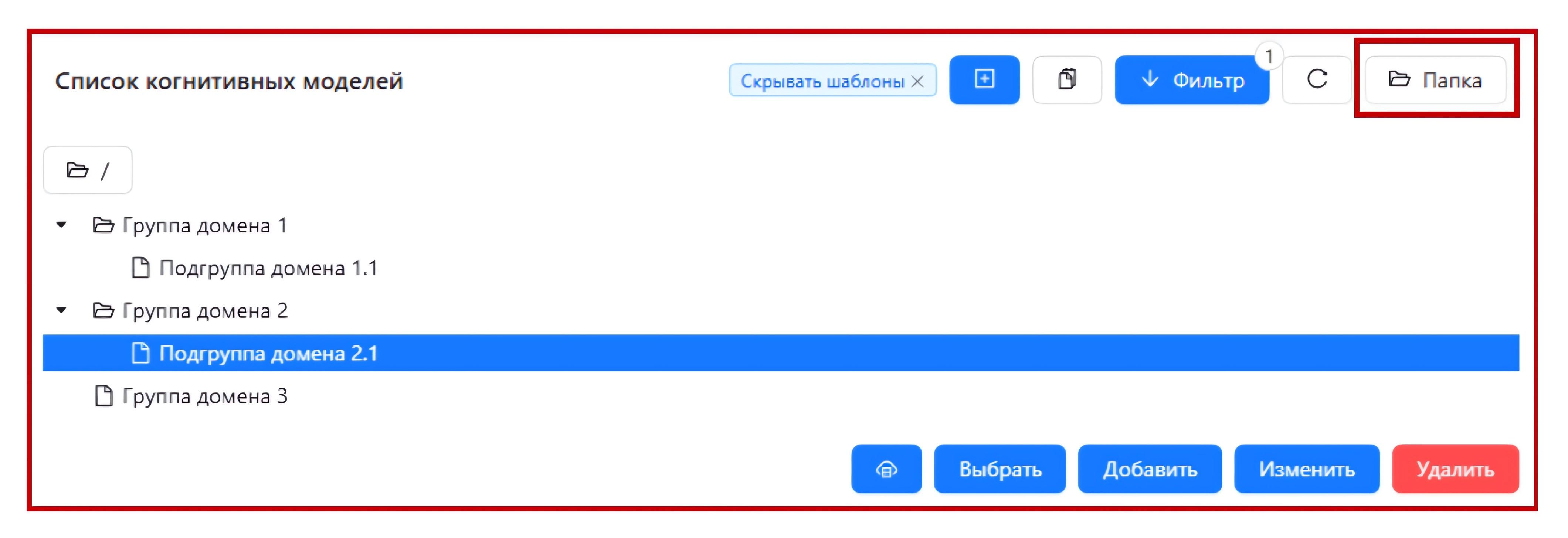 - Элементы управления, с помощью которых пользователь может создавать, изменять и удалять объекты (когнитивные модели), выполнять дополнительные бизнес операции над выбранной моделью (редактирование структуры модели, запуск процесса обучения модели).