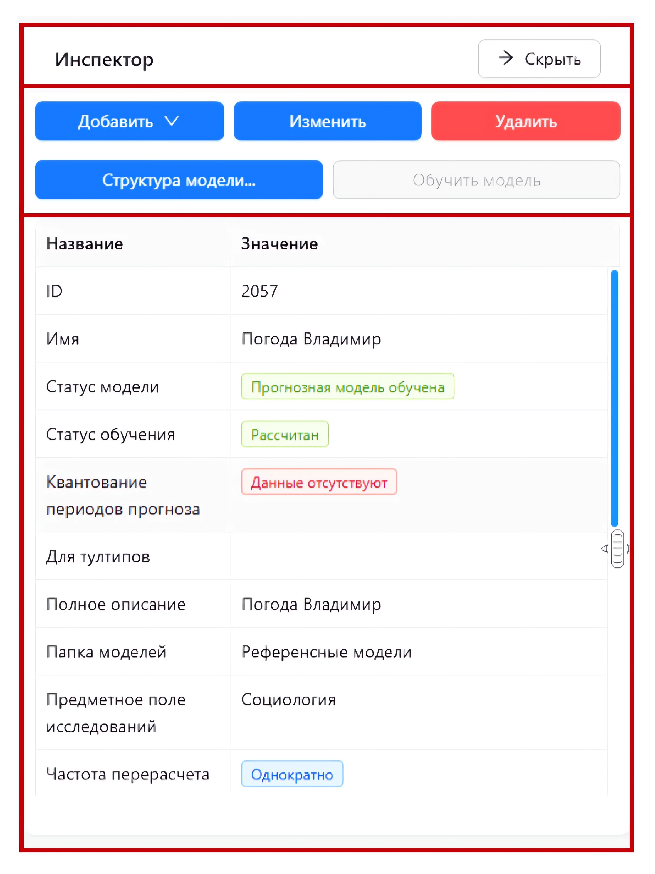 Панель Инспектор является инструментом для отражения свойств выбранного объекта (когнитивной модели) и их редактирования: