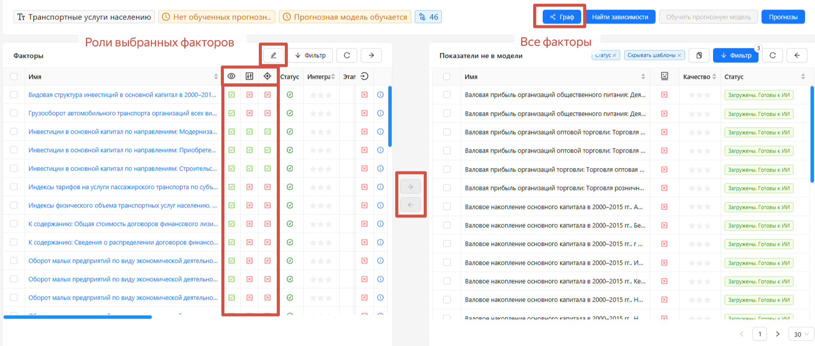 - «С правом воздействия» - показатели, на которые имеет возможность воздействовать пользователь (вводить импульс на фактор, чтобы смоделировать другой прогноз).