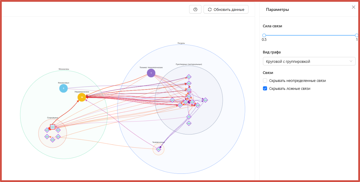 Ниже на примере изображен вариант графа «Круговой с группировкой». Показаны все расчетные связи с силой от 0,5 до 1 между факторами.