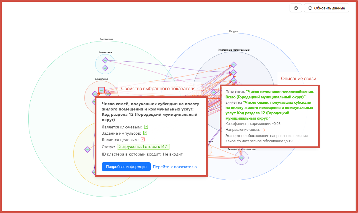 Система с помощью ИИ определяет связи, их направленность («От», «К», «Двунаправленная», «Неопределенная» (корреляция найдена, но какой-показатель на что влияет не удалось выяснить), «Ложная» (корреляция найдена фактически, но логически ее нет)), рассчитывает степень зависимости (коэффициент корреляции от -1 до +1), а так же предлагает «экспертное обоснование направления влияния» между выбранными показателями.