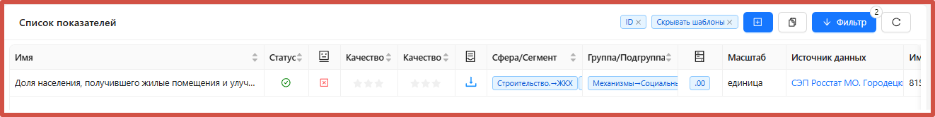 - в РМ «Показатели»: