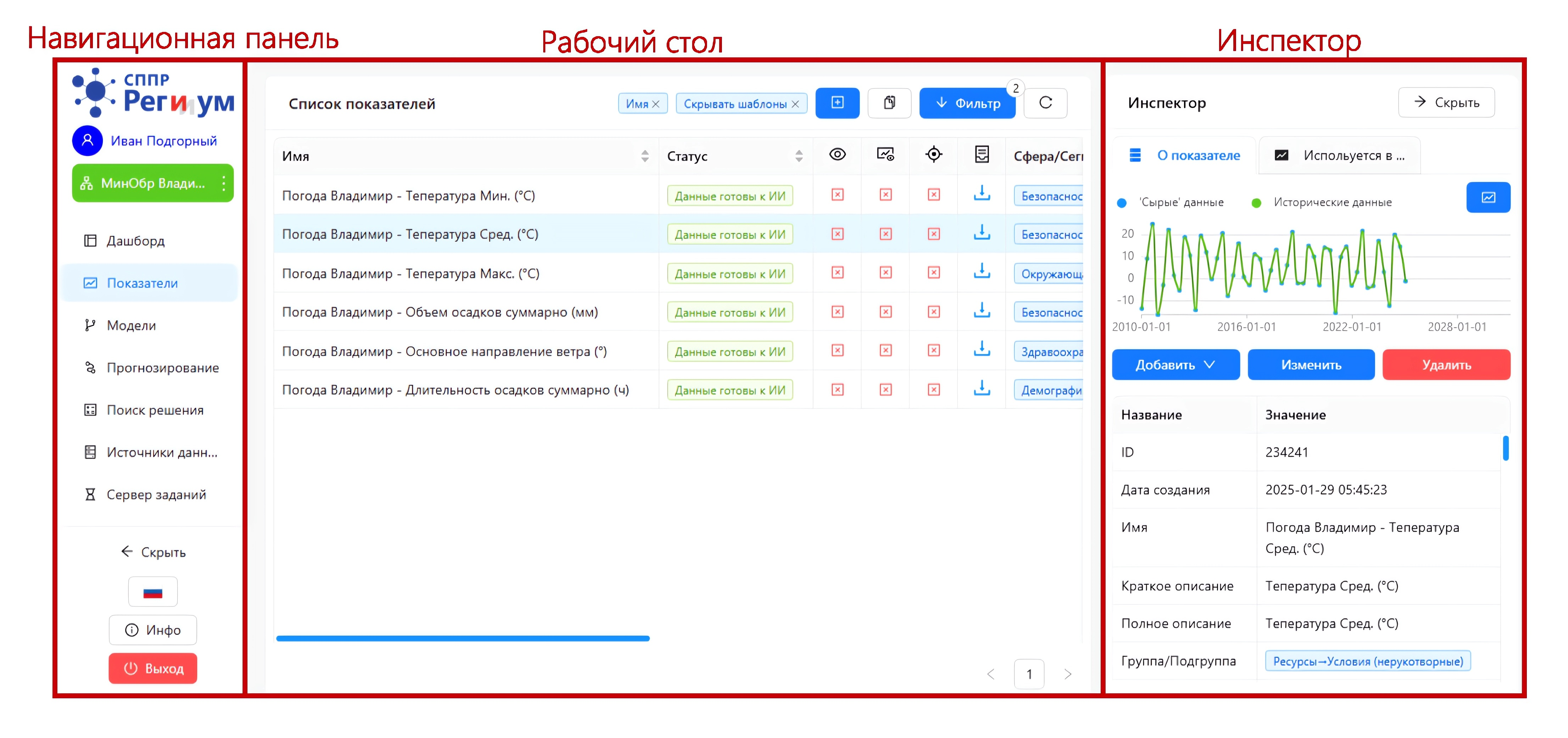 - Инспектор - инструмент для отражения свойств выбранного объекта и их редактирования, дополнительной навигации, будет описан для каждого рабочего места в отдельности.