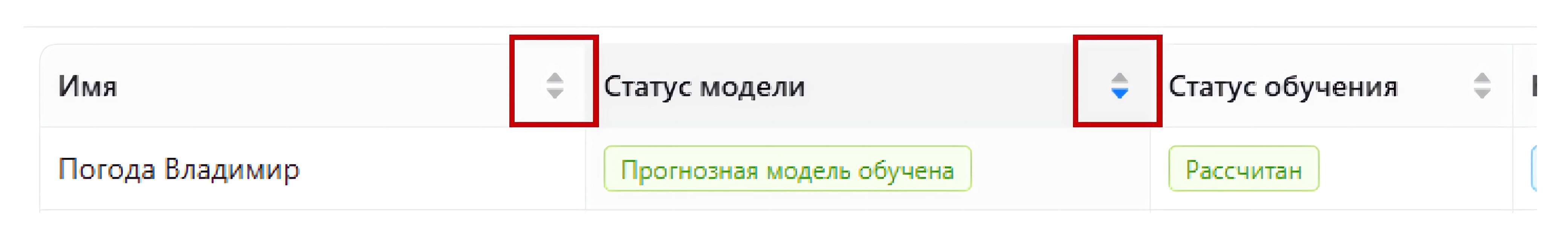На рабочих столах в заголовках таблиц объектов присутствуют индикаторы сортировки – небольшие стрелочки. Сортировка может быть только по одному признаку (по одной колонке). Цветом показывается активная сортировка.По умолчанию элементы в таблице упорядочены по дате создания.