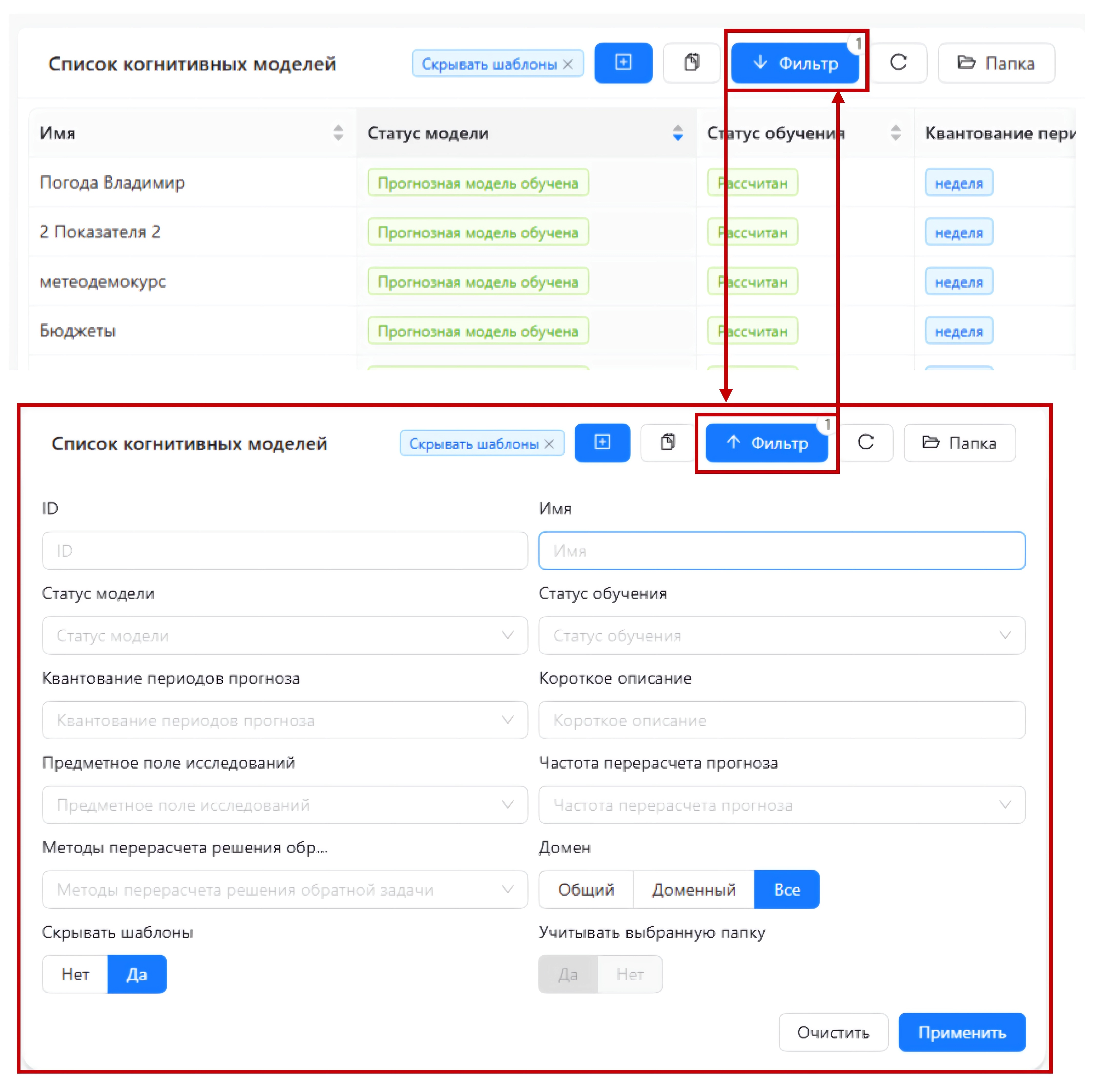 На рабочих столах из заголовков таблиц есть возможность использовать отбор, который позволяет отфильтровать данные по выбранным признакам. Область настройки отбора появляется и автоматически прячется по кнопке «Фильтр».