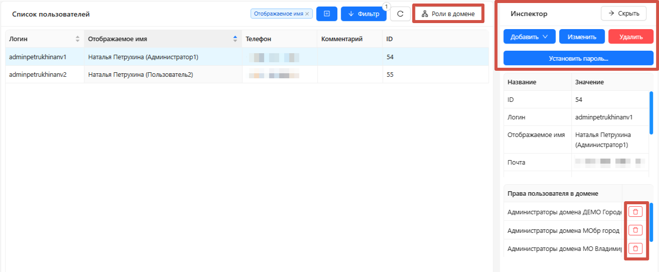 В этом РМ производится добавление/удаление пользователей и назначение/изменение им прав в рамках домена.